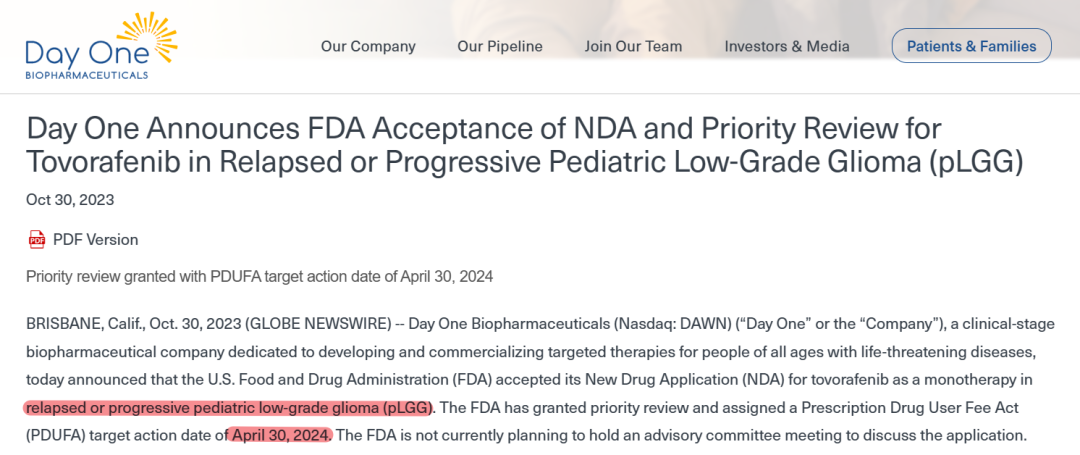 10月30日,Day One宣布Tovorafenib单药用于治疗复发或进展型儿科低级别胶质瘤(pLGG)的新药申请(NDA)获FDA受理,PDUFA日期定为2024年4月30日。