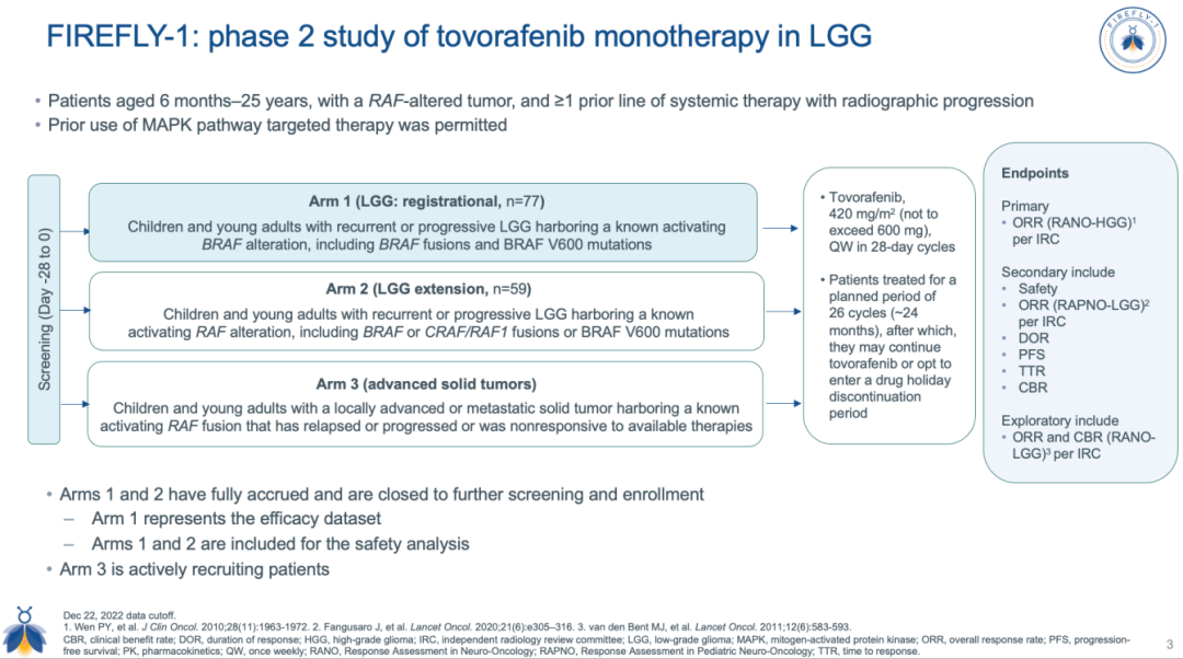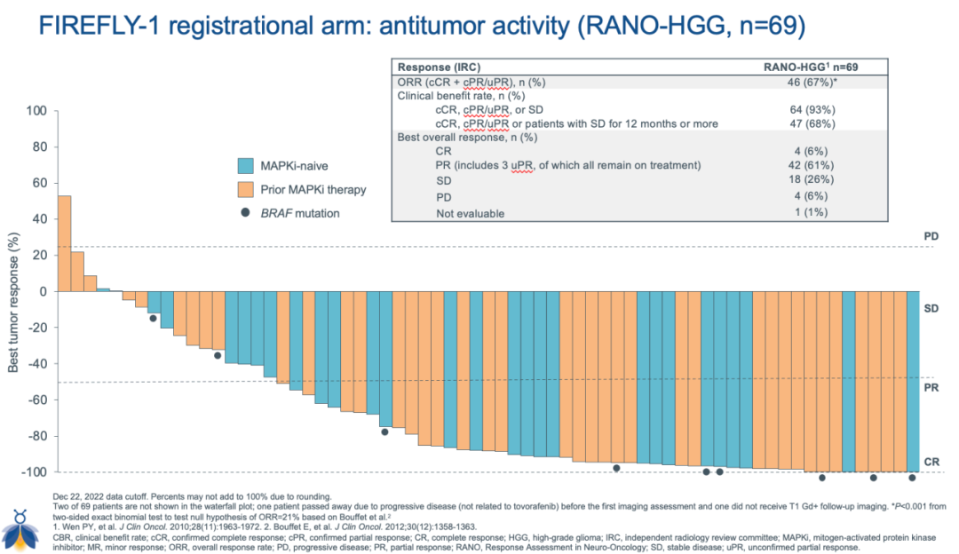 此次NDA主要是基于一项开放标签、关键II期研究(FIREFLY-1)的积极结果。该研究的队列1共纳入77例携带BRAF激活突变(包括BRAF融合和BRAF V600突变)且至少接受过一种系统治疗的6月龄-25岁复发或进展型低级别胶质瘤(LGG)患者,评估了Tovorafenib(每周1次,420mg/m2)的有效性和安全性。研究的主要终点为盲法独立中央审查(BICR)基于神经肿瘤学高级别胶质瘤应答评估(RANO-HGG)标准评估的客观缓解率(ORR)。