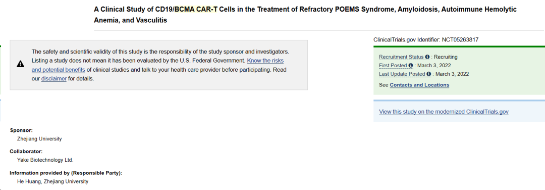 在clinicaltrials.gov上,以浙江大学为发起方,有一项CD19/BCMA CAR-T治疗难治性POEMS综合征、淀粉样变性、自身免疫性溶血性贫血和血管炎的临床研究。此外,还针对难治性硬皮病。