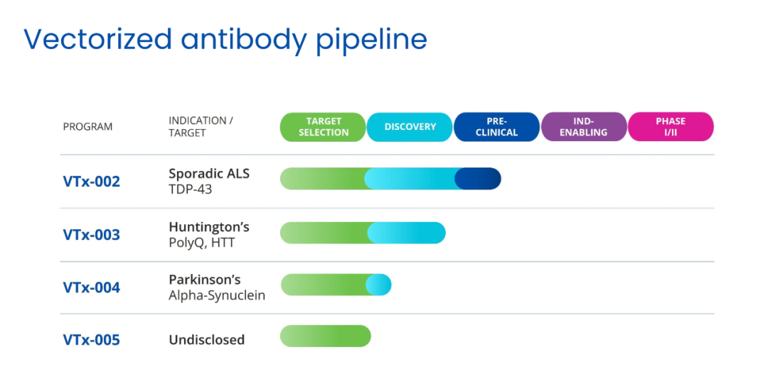 VTx-002 是一种载体化抗体疗法,使用靶向大脑神经元的 AAV 载体递送表达治疗型抗体的 DNA,该抗体能够选择性地结合细胞质中的 TDP-43 毒性聚集物并将其从细胞质中清除,并在随后恢复 TDP-43 在细胞核中的必要功能。VTx-002 目前处于临床前测试阶段。