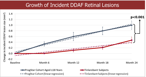 比较Tinlarebant治疗受试者和ProgStar受试者24个月的DDAF病变增长情况,结果显示Tinlarebant治疗受试者在24个月的治疗期间DDAF病变增长持续较低(p<0.001)。