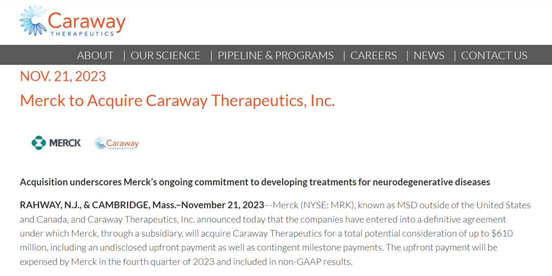 11月21日,制药巨头默沙东默沙东(MSD)宣布,将以6.1亿美元收购生物技术公司Caraway Therapeutics,潜在对价包括一笔未披露的预付款和或有的里程碑付款。默沙东将在2023年第四季度支付预付款,并计入非美国通用会计准则(Non-GAAP)业绩。
