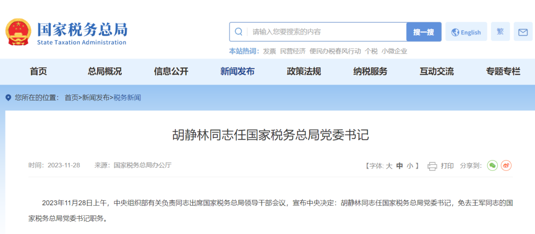 据国家税务总局网站28日消息,2023年11月28日上午,中央组织部有关负责同志出席国家税务总局领导干部会议,宣布中央决定:胡静林同志任国家税务总局党委书记,免去王军同志的国家税务总局党委书记职务。 公开简历显示,胡静林,男,汉族,1964年6月生,安徽歙县人,1987年6月加入中国共产党,1988年8月参加工作,中国人民大学工业经济系、劳动人事学院研究生毕业,获经济学博士学位。 他曾长期在财政部工作,历任:财产评估司副司长,经济建设司副司长,经济建设司司长,办公厅主任、新闻发言人等职。 2009年,他任财政部部长助理、党组成员,2014年任财政部副部长,2018年任国家医疗保障局党组书记、局长。 2018年5月,国家医疗保障局正式挂牌成立,胡静林出任了首任局长、党组书记。任职国家医保局长五年多来,胡静林持续推进医保基金筹资、医保谈判和集中带量采购等工作,将加强医保基金监管、维护基金安全作为首要任务,严厉打击各种违规违法使用医保基金的行为,并公开表示“绝不让医保基金成为‘唐僧肉’”。