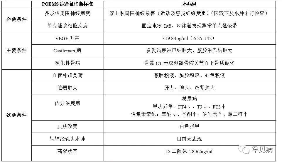 总之,POEMS综合征是一种少见但具有独特症状的疾病。如果您出现了类似的症状,建议及时就医并接受专业的检查和治疗。虽然目前还没有完全治愈POEMS综合征的方法,但是通过及时治疗可以有效地缓解症状并提高患者的生活质量。
