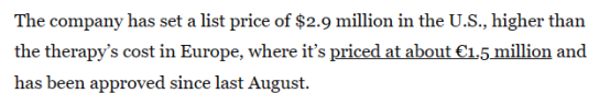 Biomarin估计,根据平均患者体重和一次性治疗所需的瓶数,再加上折扣,估算每年每位患者花费约为90万美元。