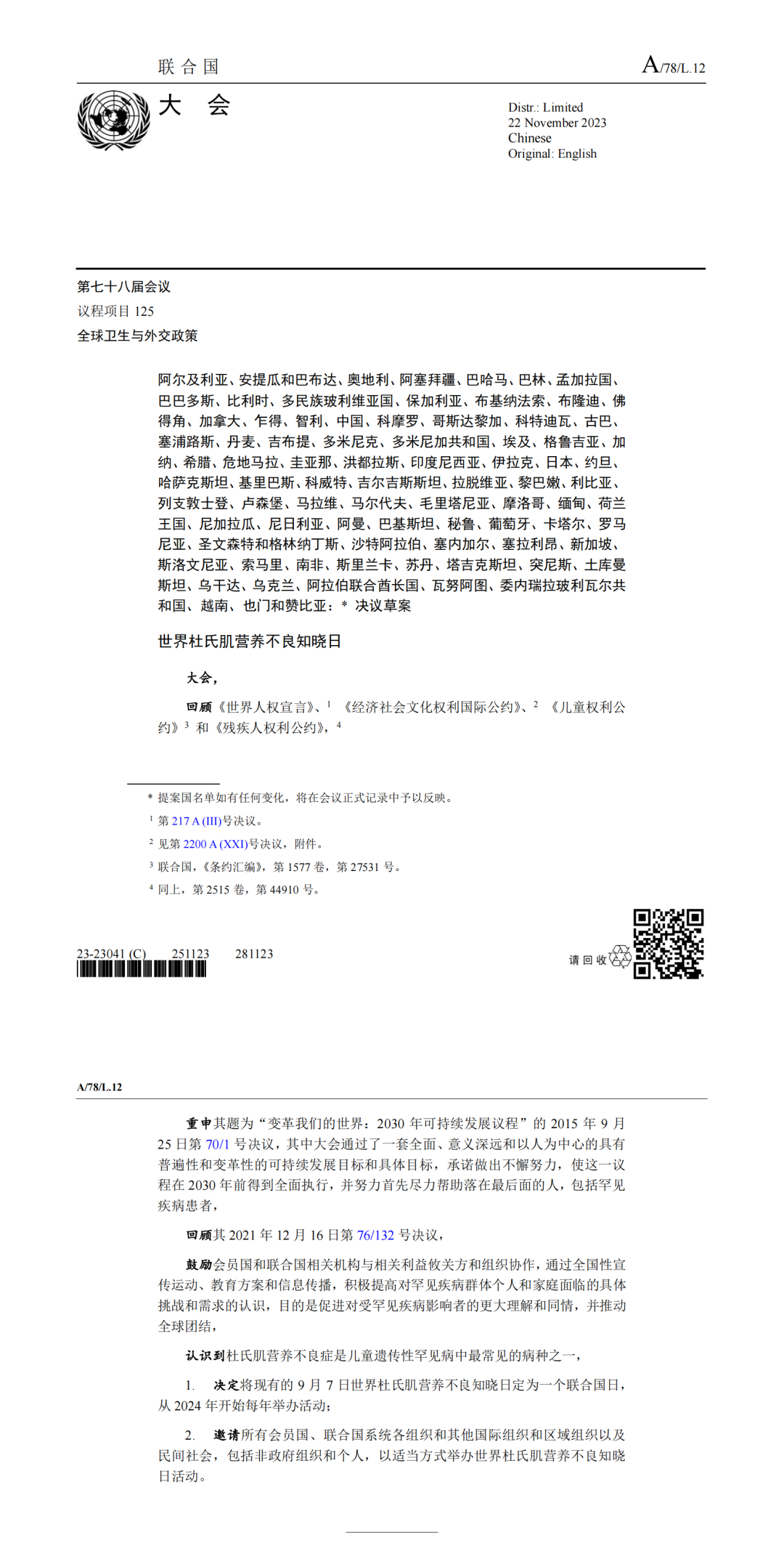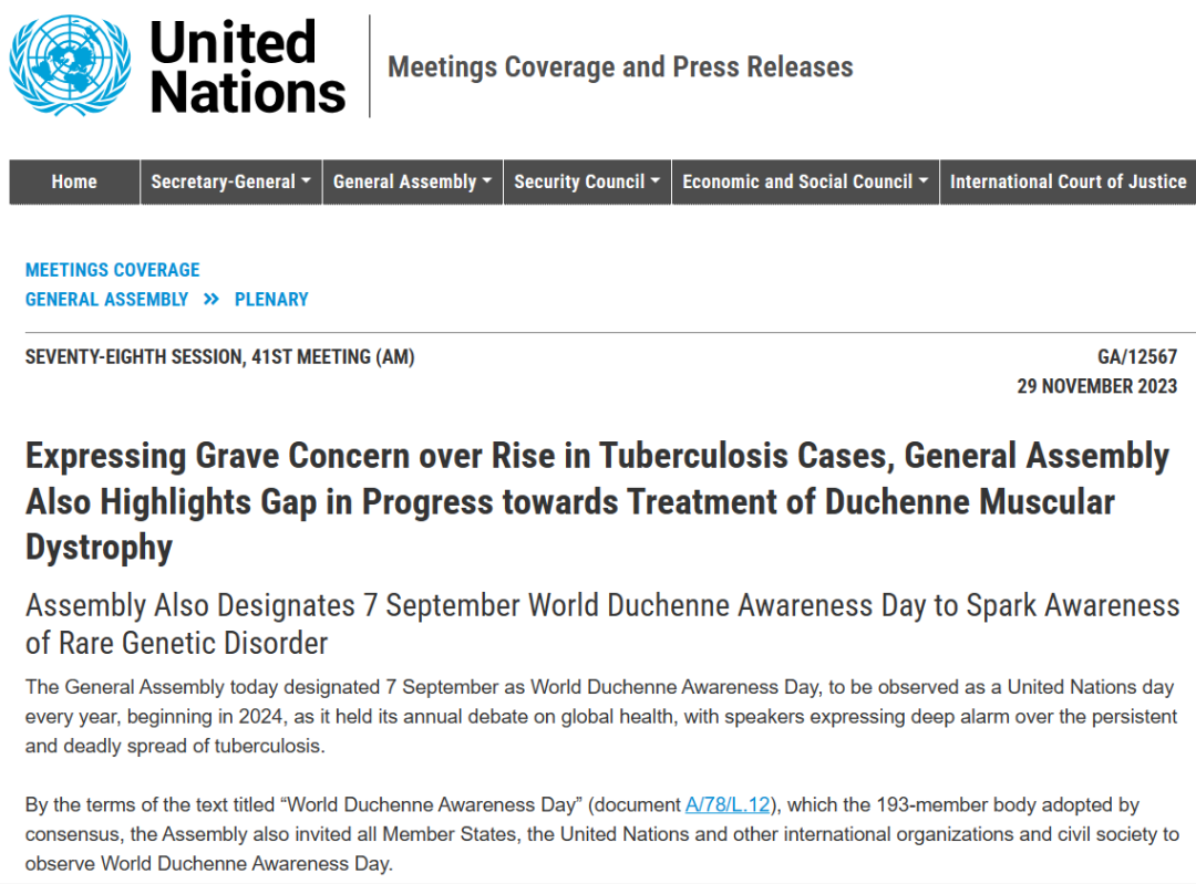 2023年11月29日,联合国大会在第七十八届会议、第41次会议发布文件决定将现有的9月7日世界杜氏肌营养不良知晓日定为一个联合国日,从2024 年开始每年举办活动。