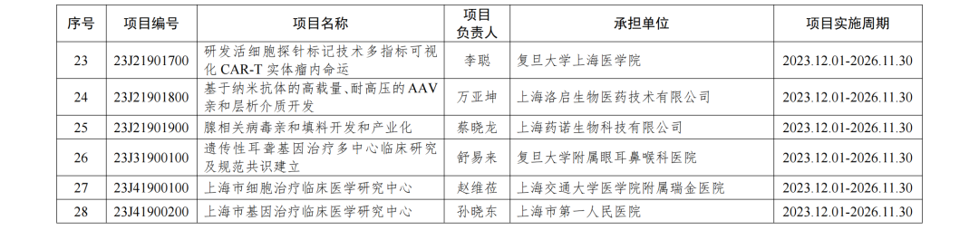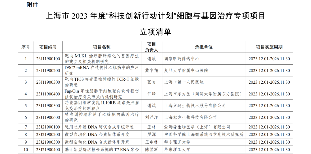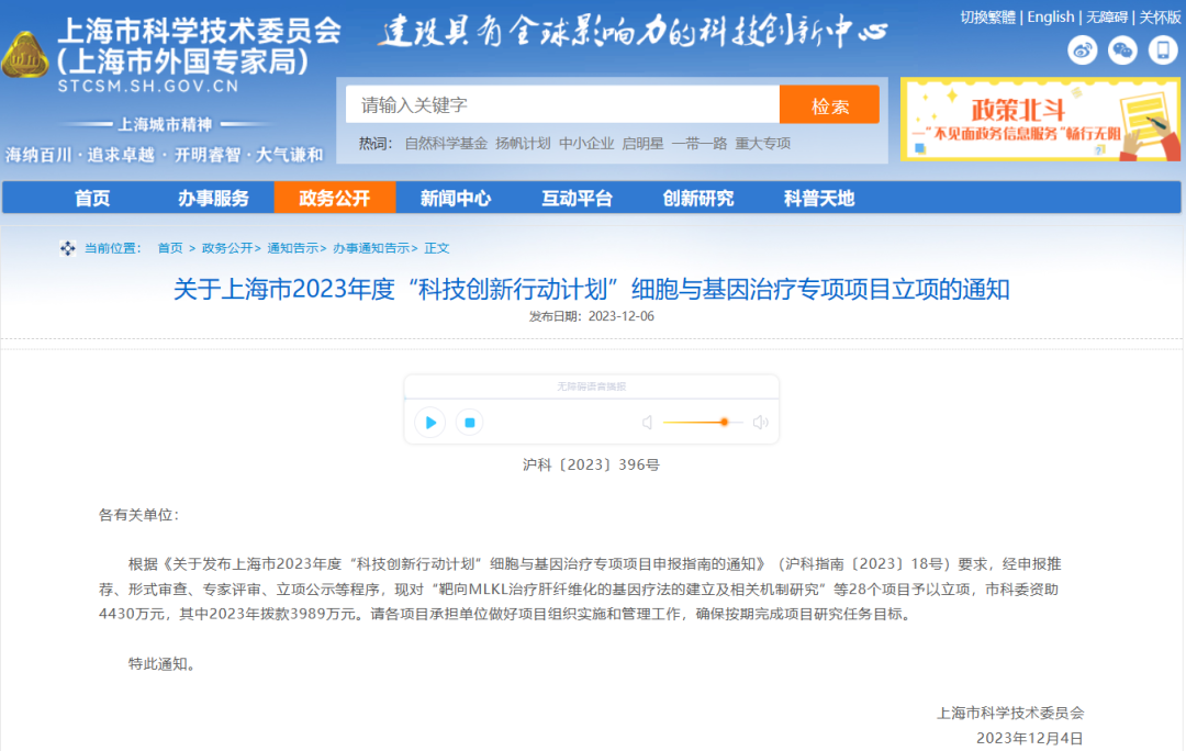 12月6日,上海市科学技术委员会发布《关于上海市2023年度“科技创新行动计划”细胞与基因治疗专项项目立项的通知》(沪科指南〔2023〕18号)。通知指出,经申报推荐、形式审查、专家评审、立项公示等程序,现对“靶向MLKL治疗肝纤维化的基因疗法的建立及相关机制研究”等28个项目予以立项,市科委资助4430万元,其中2023年拨款3989万元。请各项目承担单位做好项目组织实施和管理工作,确保按期完成项目研究任务目标。