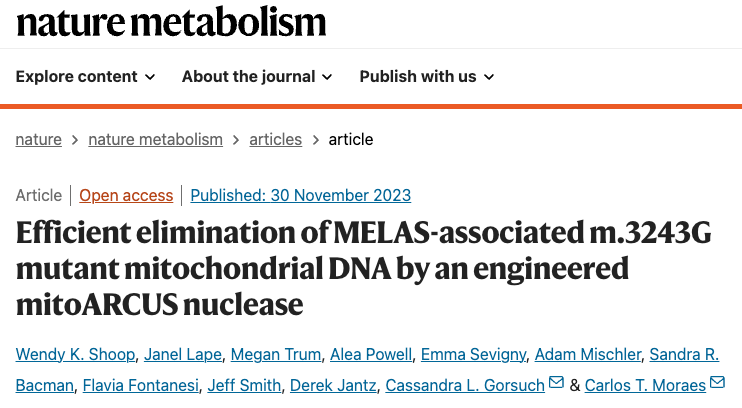 2023年11月30日,迈阿密大学米勒医学院和Precision公司的研究人员在 Nature 子刊 Nature Metabolism 上发表了题为:Efficient elimination of MELAS-associated m.3243G mutant mitochondrial DNA by an engineered mitoARCUS nuclease 的研究论文。