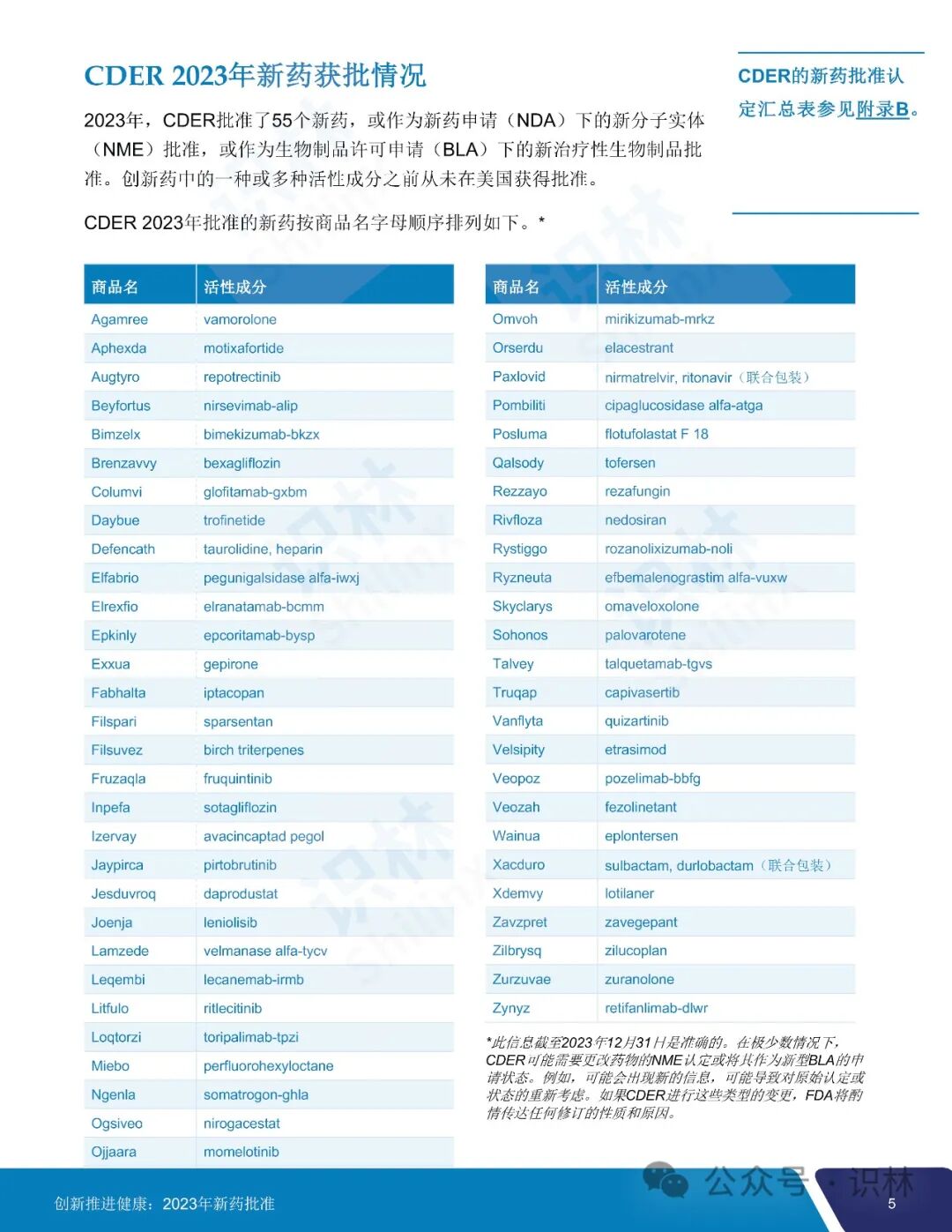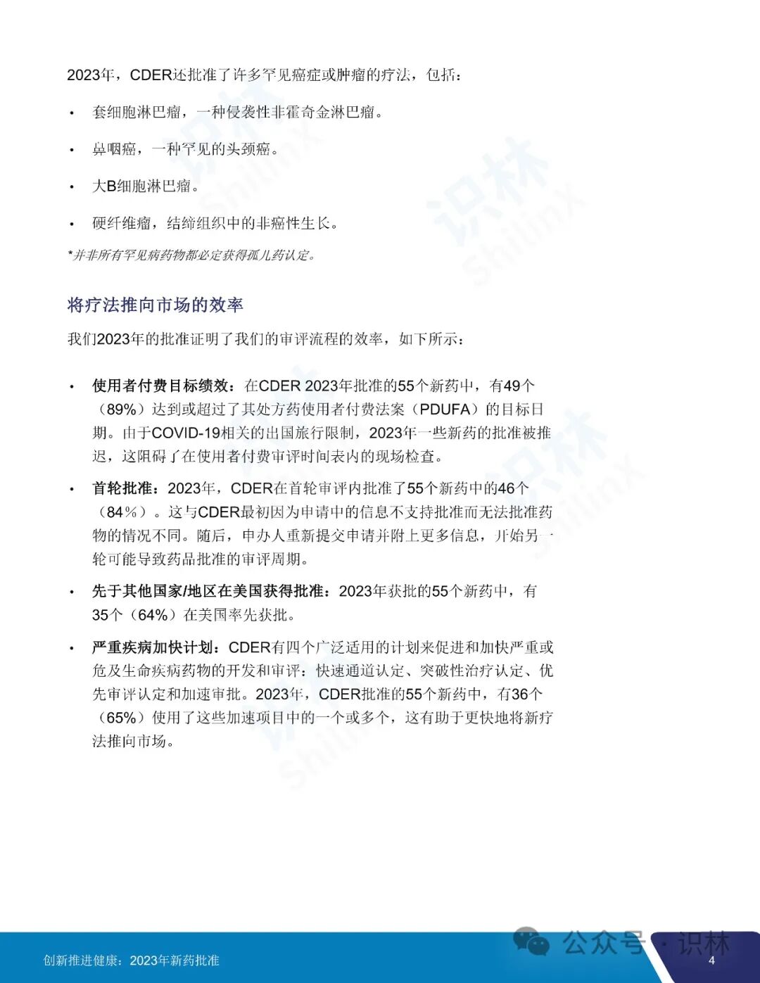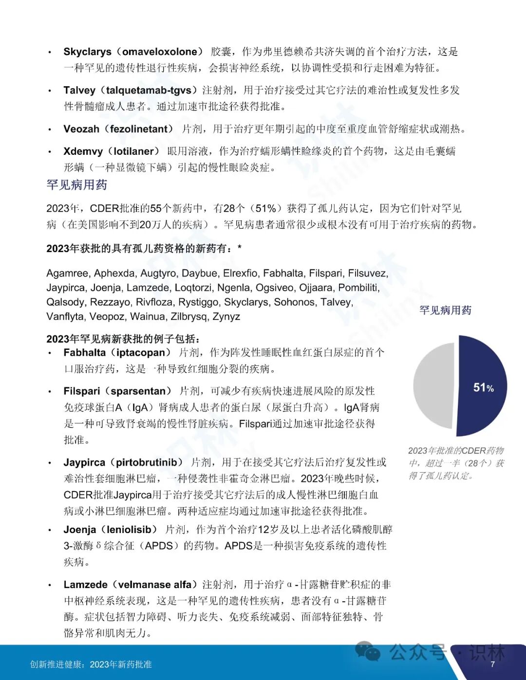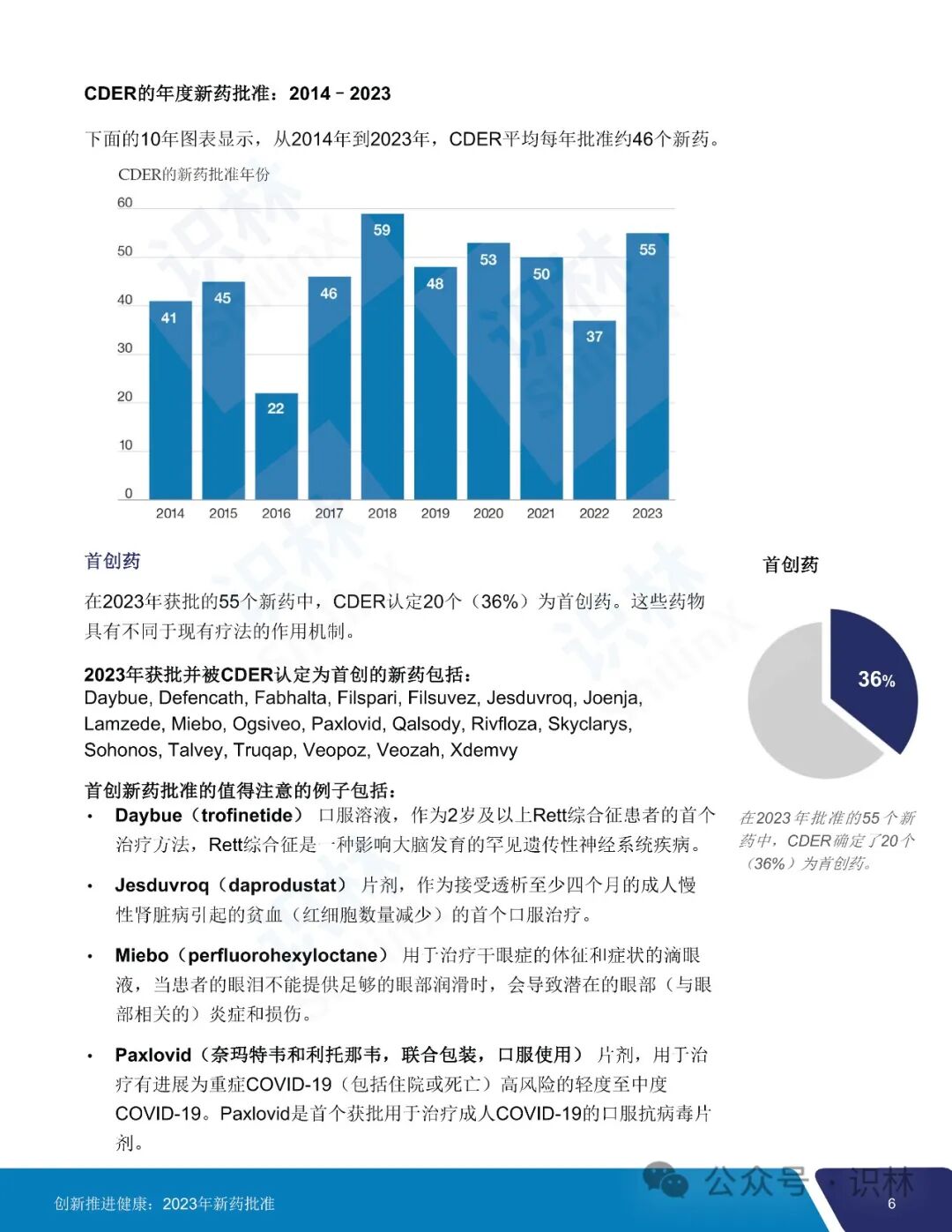 2023 年 CDER 共批准了 55 个新药,其中 20 个(36%)首创新药,28 个(51%)罕见病用药。