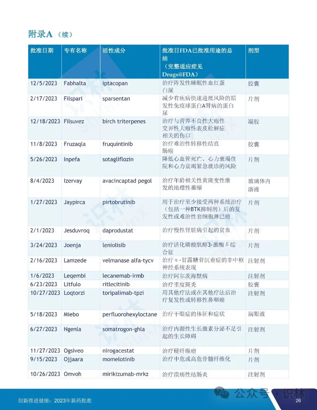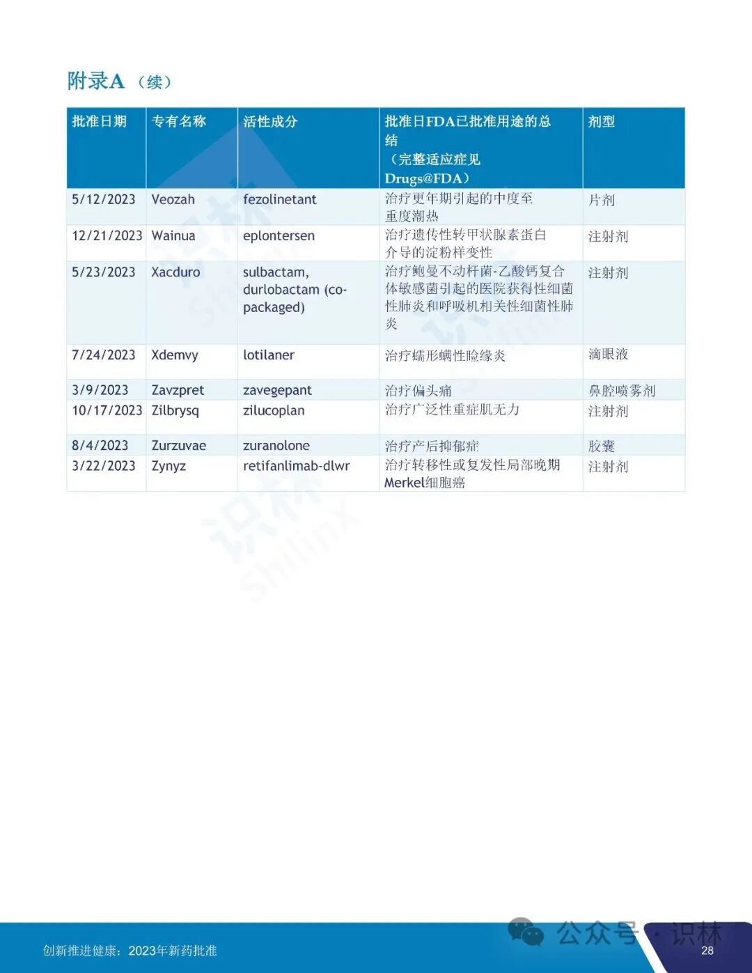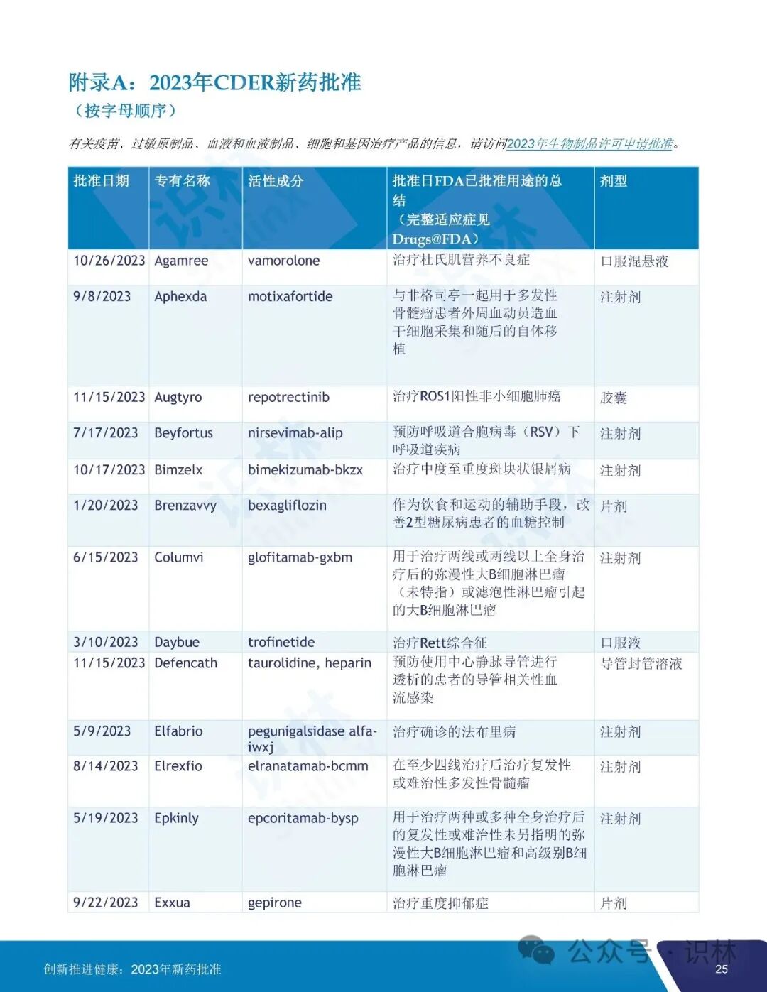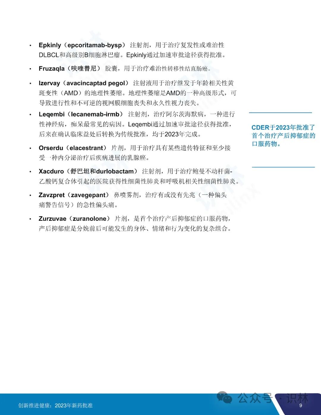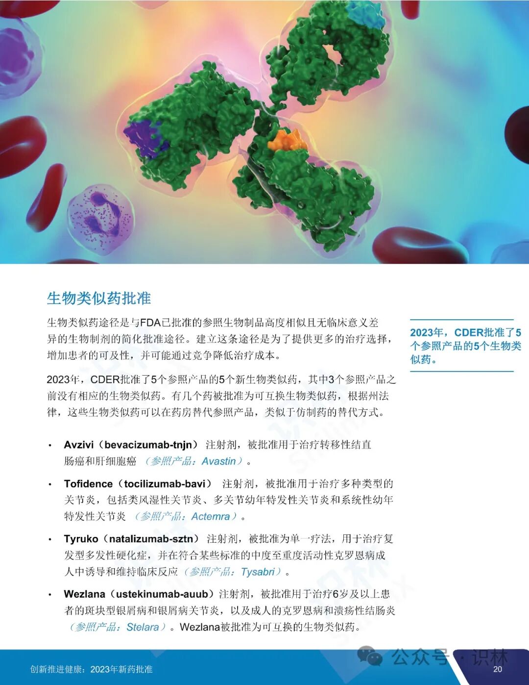 美国 FDA 于 2024 年 1 月 8 日发布了其 2023 年度 FDA 新药审批总结报告。报告汇总了 FDA 药品审评与研究中心(CDER)去年一年中批准的所有新药、新用途和新使用人群以及生物类似药和可互换生物类似药、新配方和新剂型以及儿科人群扩展,概述了一系列值得注意的批准,提供了许多 CDER 批准的新治疗药物促进患者健康的有价值实例。