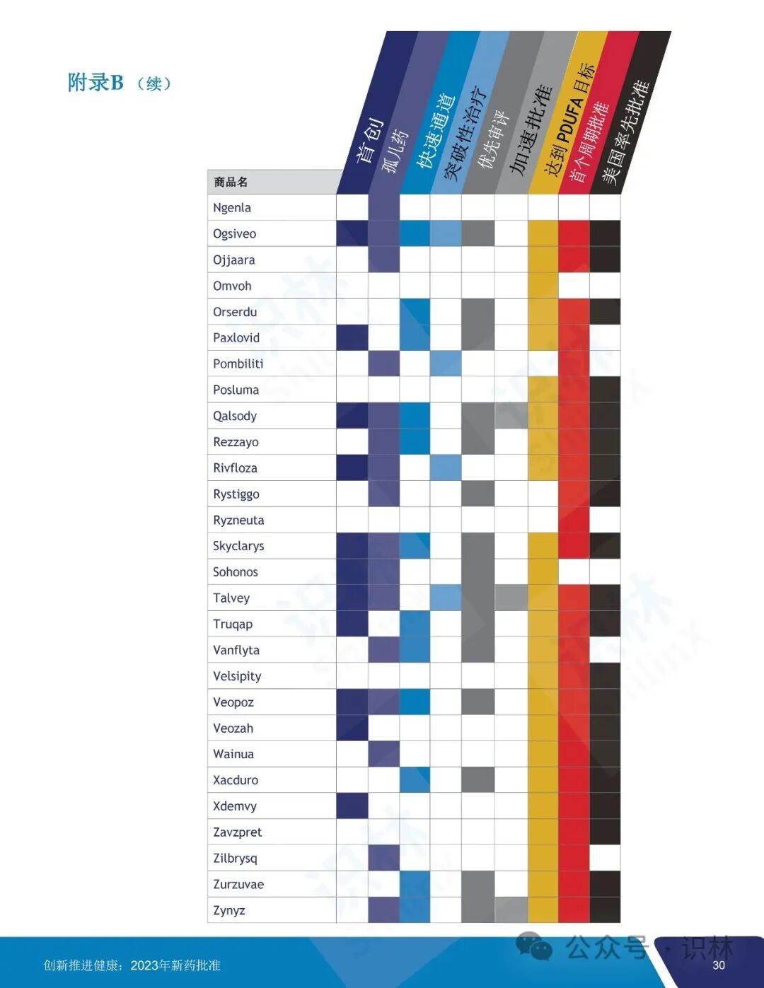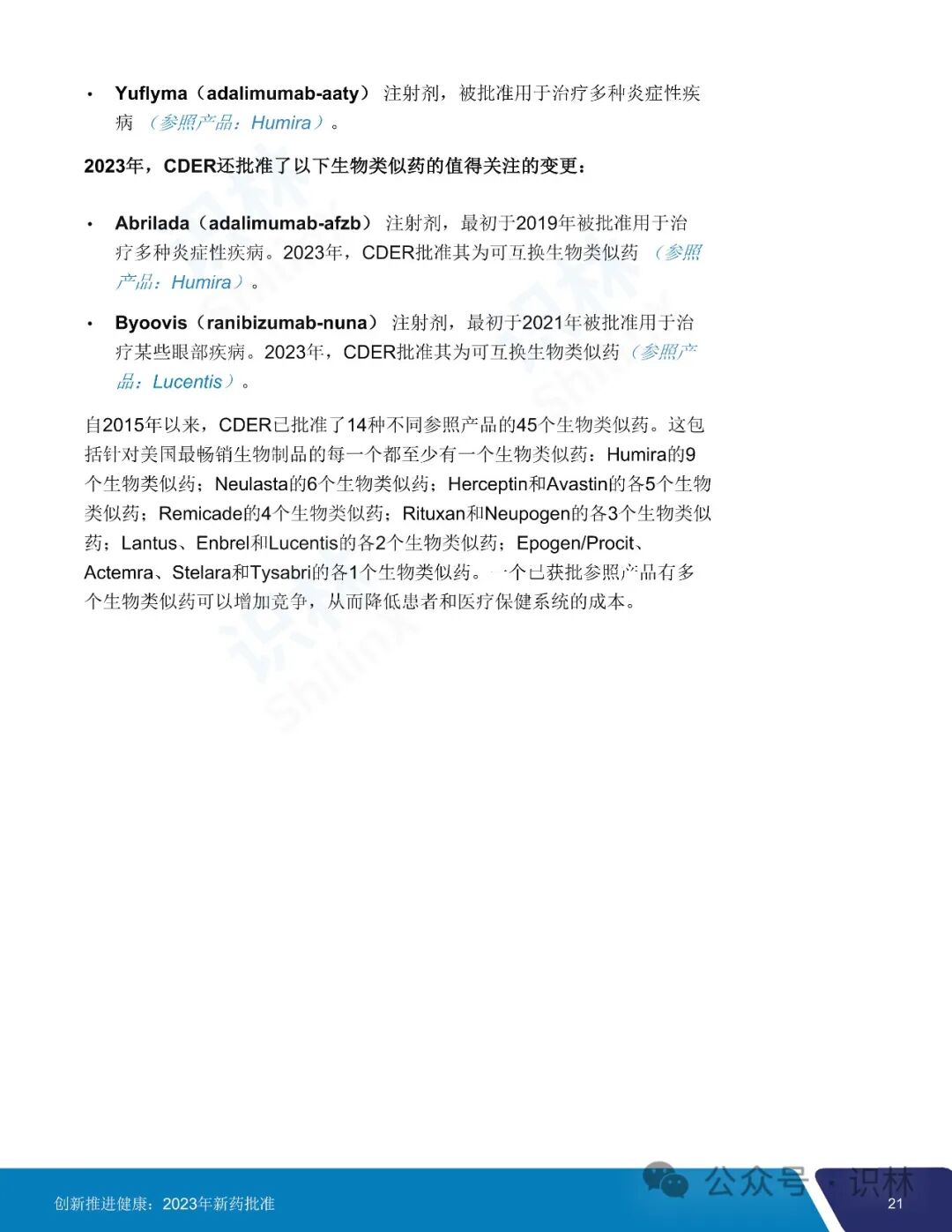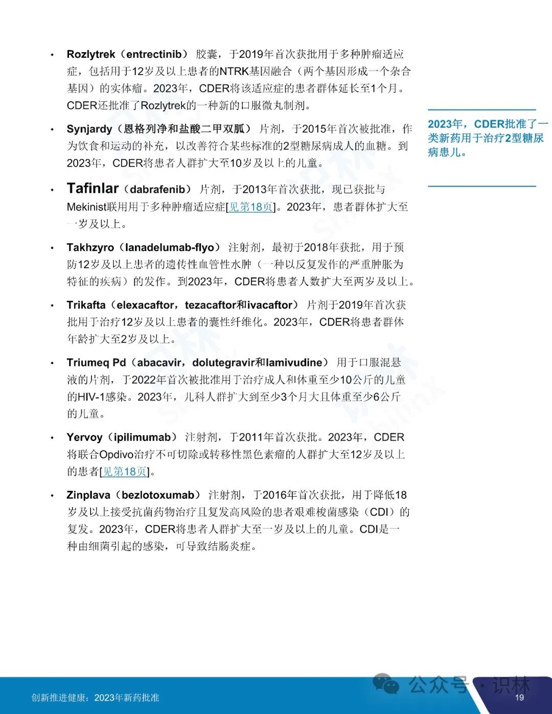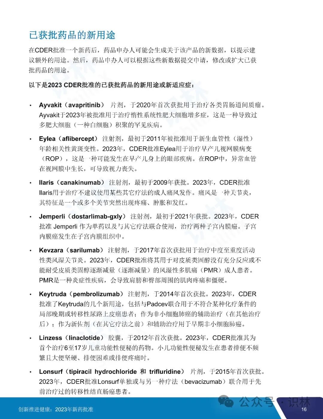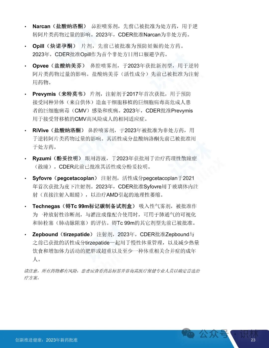 美国 FDA 于 2024 年 1 月 8 日发布了其 2023 年度 FDA 新药审批总结报告。报告汇总了 FDA 药品审评与研究中心(CDER)去年一年中批准的所有新药、新用途和新使用人群以及生物类似药和可互换生物类似药、新配方和新剂型以及儿科人群扩展,概述了一系列值得注意的批准,提供了许多 CDER 批准的新治疗药物促进患者健康的有价值实例。
