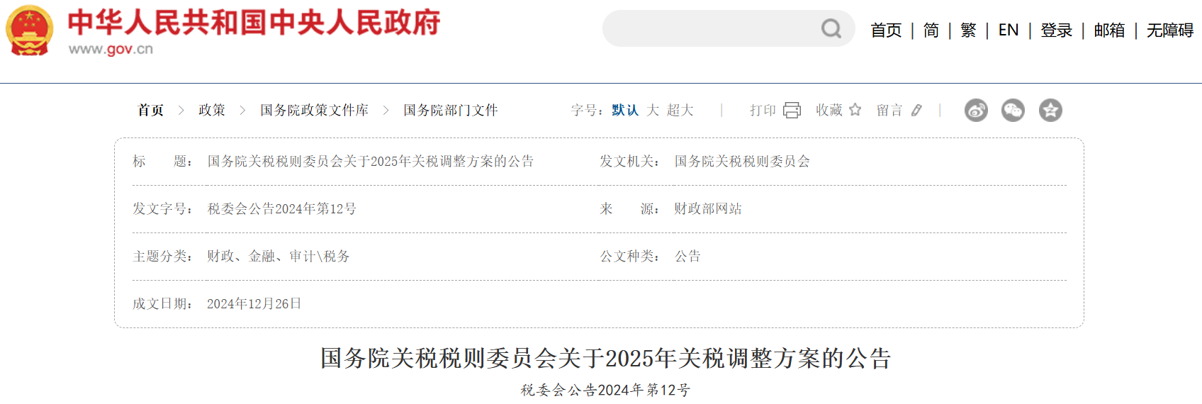 每逢年末,我国会根据经济社会发展情况,对部分商品的关税税率和税目进行调整。近日,国务院关税税则委员会对外发布公告,明确了2025年我国关税调整方案。