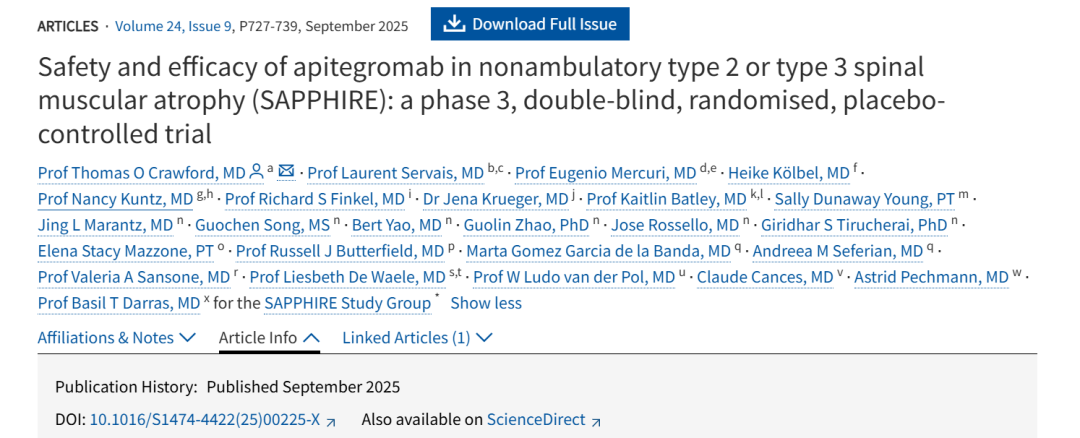 《柳叶刀》子刊最新发表的Ⅲ期SAPPHIRE试验数据显示:与安慰剂相比,Apitegromab可使不可独立行走的2型或3型SMA患者的运动功能获得具有统计学意义且潜在具有临床意义的改善。SAPPHIRE是首个在安慰剂对照临床研究中,证实选择性抑制肌抑制素能够带来功能获益的研究(适用于任何疾病)。此外,通过靶向结构上不同的肌抑制素前体形式,Apitegromab可避免因阻断与成熟肌抑制素在抗原性上相似的生长因子(如生长分化因子11,GDF11)而产生的脱靶效应。这种高度选择性的策略可最大限度降低不期望的脱靶影响。