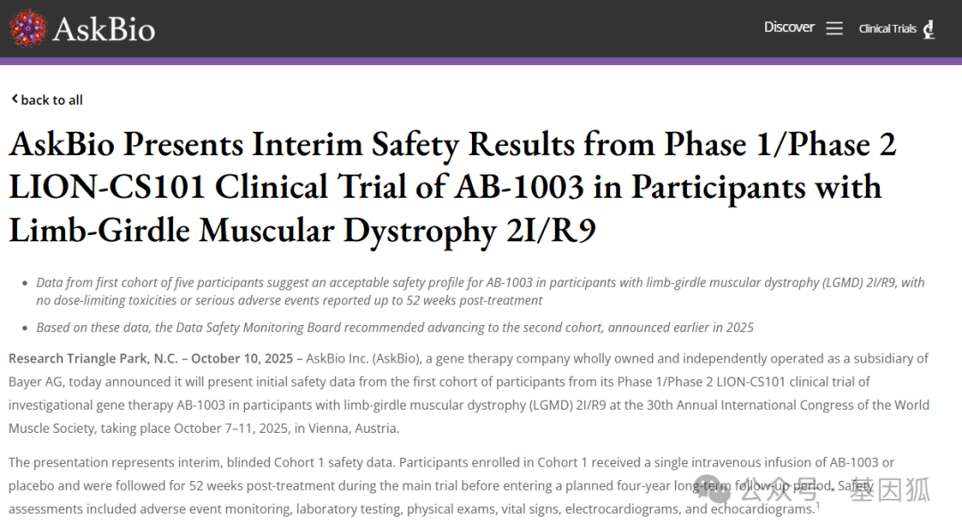 近日,在刚刚落幕的第30届世界肌肉学会 (World Muscle Society, WMS) 年会上,拜耳旗下子公司AskBio公布了其在研AAV基因疗法AB-1003 (LION-101) 治疗2I/R9型肢带型肌营养不良症 (LGMD2I/R9) 的I/II期LION-CS101临床试验的首个队列中期安全性数据 (大会海报见文末)。