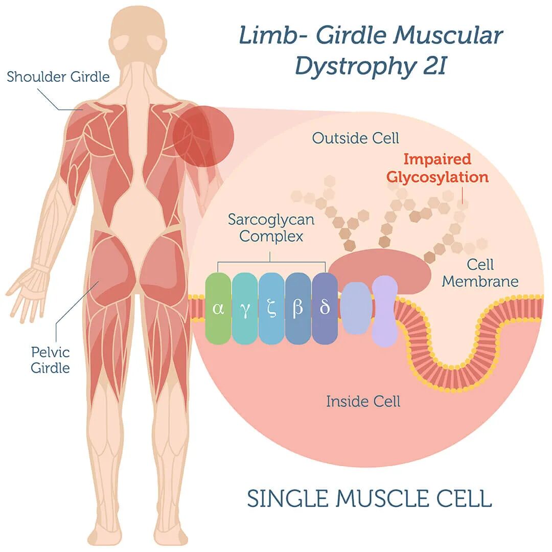 肢带型肌营养不良症 (LGMD) 是一组遗传异质性极高的罕见肌肉疾病,其特征是骨盆带和肩带肌肉进行性无力和萎缩。其中,由FKRP基因突变引起的LGMD2I/R9亚型会导致Fukutin相关蛋白功能缺陷,影响肌肉细胞的正常功能。患者通常从儿童期到成年期发病,最终可能依赖轮椅生活,并面临心肺功能衰竭的风险。