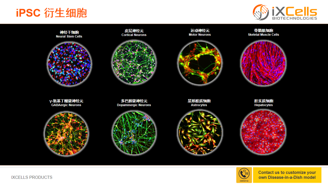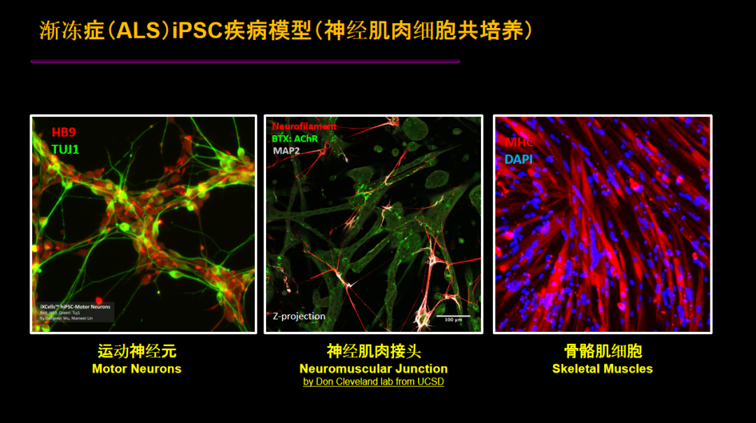 科学家有无限来源的原始细胞不停分化成不同种类的细胞,在研究很多神经发育的疾病时,可以用病人的血重编程iPSC再诱导成神经元,在两三个月的时间内得到患者的神经元在体外进行一些基因的操作,去了解这个病到底是缺失了这个基因还是这个基因造成了毒性,这就叫机制研究,同时也可以用这些细胞系进行药物筛查。iPSC衍生细胞很多都是神经类的细胞,也可以诱导成骨骼肌细胞或者肝脏的细胞。
