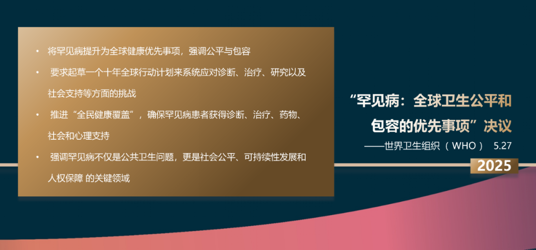 过去十多年,我们参与并推动中国罕见病公益事业的历程,始终置于这一全球共同框架之下。我们必须认识到,WHO正在践行2021年与2023年的联大决议。今年5月,世卫大会通过的决议极为重要,它确立了罕见病作为全球公共卫生优先事项的地位。