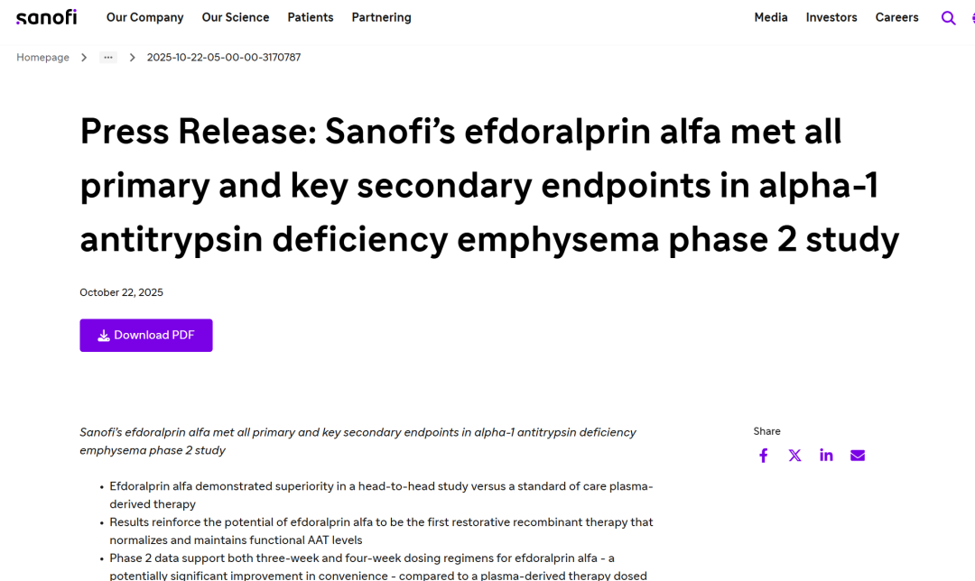 10月22日,赛诺菲宣布了其在研药efdoralprin alfa(SAR447537,前身为INBRX-101)在全球ElevAATe II期研究中取得了积极结果,在每三周(Q3W)/四周(Q4W)给药方案下,达成所有主要及关键次要终点。该药用于治疗罕见病α-1-抗胰蛋白酶缺乏症(AATD)。