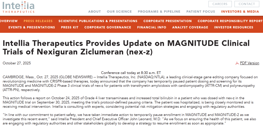受此消息影响,Intellia 股价当日跌幅超 40%,目前市值已降至 16 亿美元。此次暂停的直接原因是 10 月 24 日公司收到的一份安全性报告:一名参与 MAGNITUDE 试验(ATTR-CM 适应症)并接受 nex-z 给药的患者,出现了达到 4 级标准的肝转氨酶与总胆红素升高(临床中 4 级不良反应通常指严重或危及生命的情况)。该事件达到了试验方案中预设的暂停标准,目前这名患者已住院接受密切监测与医疗干预,具体病情仍在跟踪中。
