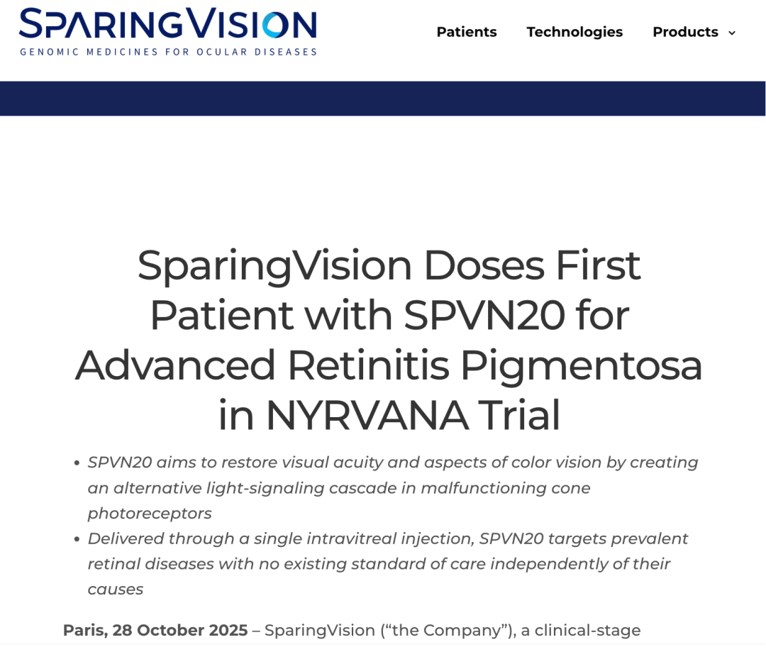 2025 年 10 月 28 日,基因组医学公司 SparingVision 官宣重大进展,其针对晚期色素性视网膜炎的 NYRVANA 首次人体临床试验,已成功为首位患者完成 SPVN20 给药。