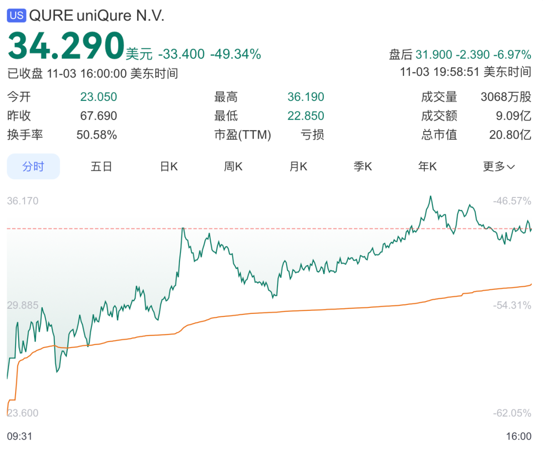 然而,福泰制药今日特别指出,基于 I/II 期研究与外部对照的数据对比,FDA 已于 4 月授予 AMT-130 突破性疗法认定,并于 2024 年 5 月授予再生医学先进疗法(RMAT)认定。受此消息影响,uniQure股价在11月3日盘前交易中暴跌66%。