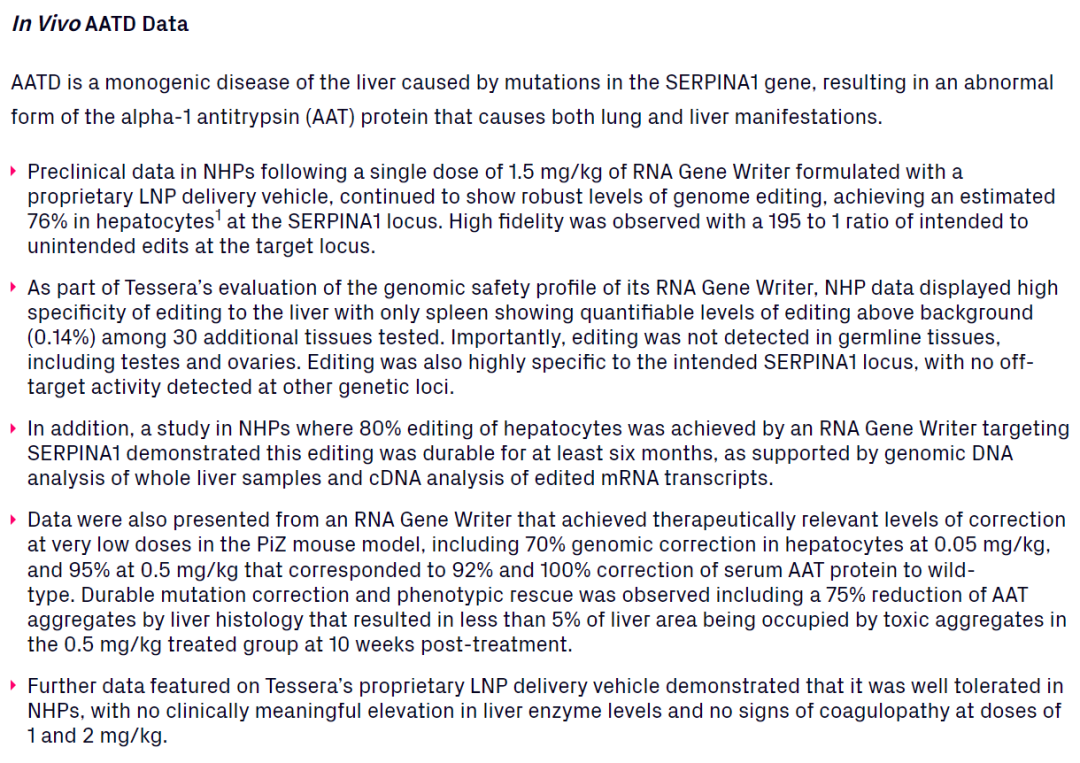 这项合作建立在Tessera在推进TSRA-196方面的最新进展之上,包括在美国ASGCT第28届年会上提交的临床前数据,该数据强调了在单剂量TSRA-196后,对小鼠和非人类灵长类动物中负责AATD的基因座SERPINA1进行持久、高保真的基因组编辑,具有高肝脏编辑特异性,无种系或脱靶编辑,使用Tessera专有的脂质纳米颗粒递送载体具有良好的安全性和耐受性。这些发现加强了TSRA-196纠正AATD潜在遗传原因的潜力,并支持其进入临床开发。