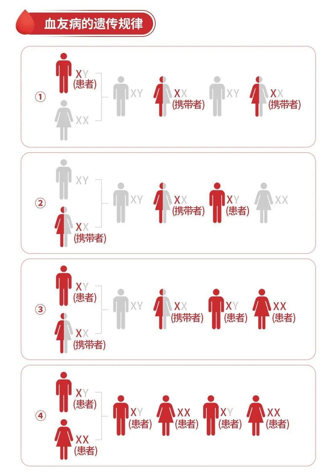 血友病主要分为两种类型:“A型”(缺乏凝血因子Ⅷ)和“B型”(缺乏凝血因子Ⅸ)。这种疾病的基因位于X染色体上,呈现出典型的“伴性遗传”特点。遗传规律决定了血友病几乎总是发生在男性身上,而女性则多为携带者——她们自己通常不发病,却能将疾病遗传给下一代。若男性血友病患者与正常女性结婚,女儿均为携带者,儿子全部健康;而女性携带者与正常男性结婚,儿子发病概率为50%,女儿有50%概率为携带者。