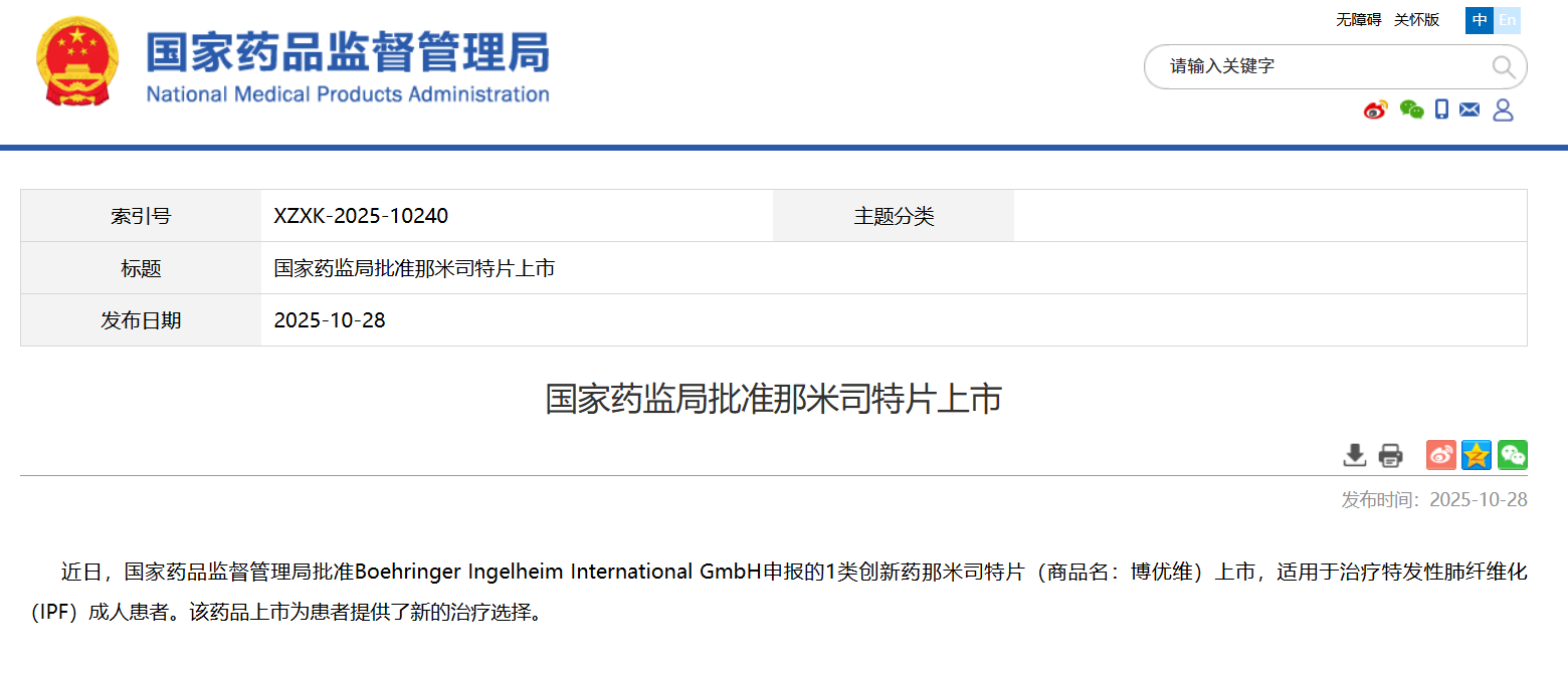这是那米司特在国内获批的第二个适应症,距离其获批治疗特发性肺纤维化(IPF)仅过去七周,足见其临床价值与审批认可的高效性。此前,该药还已获得美国 FDA 授予的优先审评资格和突破性疗法认定,并已在美国获批用于 IPF 治疗,其 PPF 适应症也正在 FDA 优先审评中,同时在欧盟、英国、日本等多个国家和地区的注册审查也在推进,预计 2026 年将惠及更多国家患者。