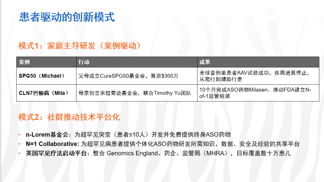 家庭与社群自筹:SLC6A1 癫痫患者母亲 Amber Freed 联合全球家庭众筹 400 万美元,推动 ASO 及老药新用管线;Michael 家庭通过基金会整合 80 个家庭资源,募集 300 万美元。