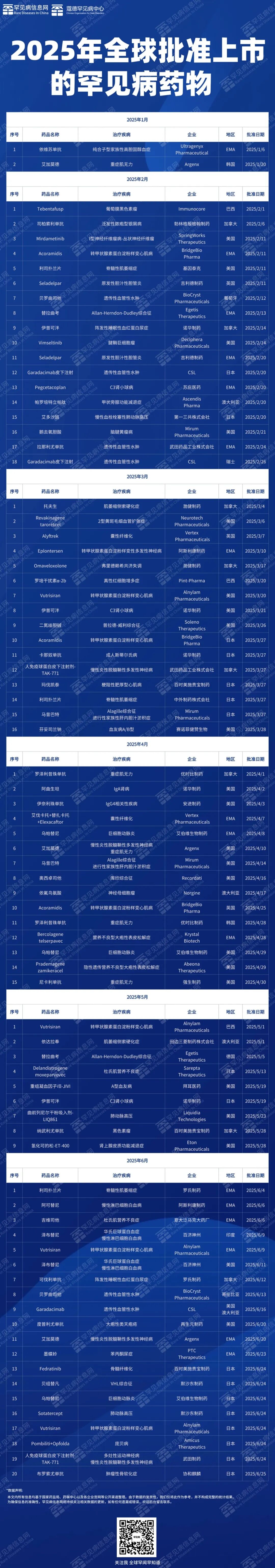 本文为年终盘点—“新药篇(全球)”—2025年1月到6月,据罕见病信息网不完全统计,全球各国累计批准60多种罕见病药品。