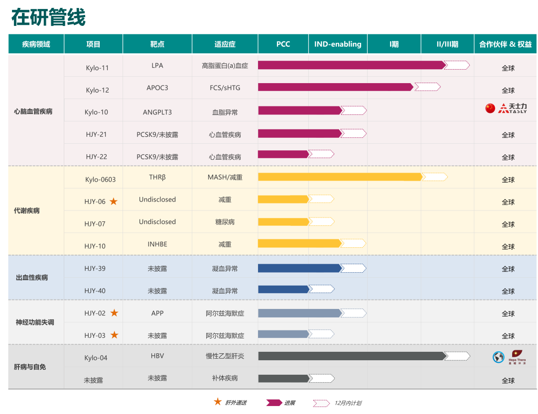 管线层面,赫吉亚的创新潜力同样凸显。以针对罕见病的Kylo-12为例,这款具有全球BIC实力的APOC3 siRNA产品,有望实现每半年一次(或更长间隔)的超长效给药方案,计划于2026年上半年启动Ⅱ期临床试验,用于治疗高甘油三酯血症(HTG)与家族性高乳糜微粒血症(FCS)。在这类疾病的治疗领域,APOC3 siRNA疗法有望打破现有治疗困局,填补市场空白。此外,公司旗下还有多款重磅产品在推进中,包括全球首个一年一次给药的超长效Lp(a) siRNA Kylo-11,以及计划用于肥胖治疗的HJY-10、阿尔茨海默病治疗的HJY-02等,覆盖多个高未满足需求领域。