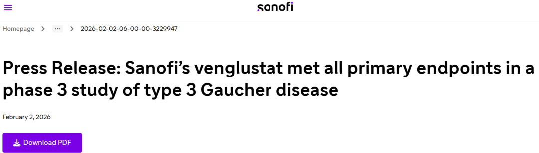 2 月 2 日,赛诺菲公布了 Venglustat 两项 III 期 LEAP2MONO 和 PERIDOT 研究结果,前者针对 3 型戈谢病(GD3),显示出了具有临床意义的疗效,后者在法布雷病中没有达到主要终点。