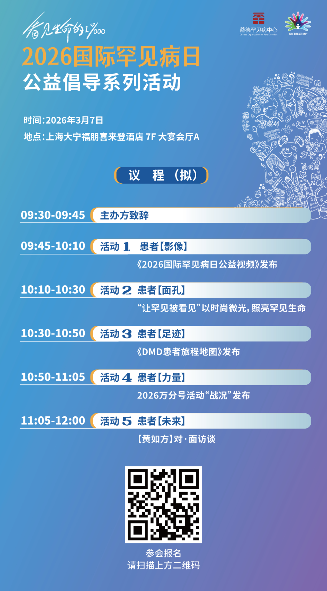作为本次宣传周的重要落地活动,上海主会场将于2026年3月7日(周六)上午隆重举办。现场将围绕患者【影像】【面孔】【足迹】【力量】与【未来】五大主题展开,具体包括:发布2026国际罕见病日中国区宣传视频、展示“让罕见被看见”以时尚微光,照亮罕见生命、解读《DMD患者旅程地图》、发布“万分号”公众倡导行动战况,并特别设立深度圆桌讨论环节——以《立法驱动下的高价值罕见病疗法多元共付体系》为主题,蔻德罕见病中心创始人黄如方先生携手政策专家、行业代表、公益伙伴及患者家庭共同参与,探讨破解罕见病“治疗难、支付难”的系统性方案,推动保障体系可持续建设。