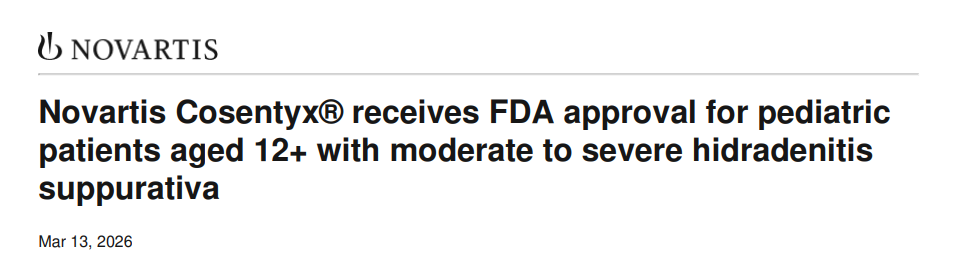 3 月 13 日,诺华(Novartis)宣布,司库奇尤单抗获美国 FDA 批准,用于治疗 12 岁及以上中重度化脓性汗腺炎(HS)儿科患者。