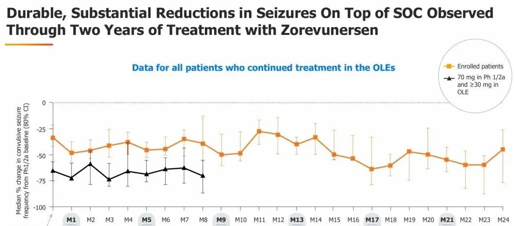 在 1/2a 期研究中,接受 2-3 剂 70mg Zorevunersen 治疗的患儿,3 个月时癫痫发作频率平均下降 85%,停药后 6 个月仍保持 74% 的降幅;而在长达 3 年的开放标签扩展研究中,接受 70mg 负荷剂量 + 45mg 维持剂量的患儿,癫痫发作频率最高下降 91%,且这种控制效果具有持续性,远优于传统抗癫痫药物。