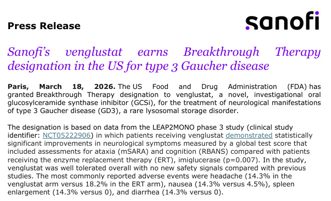 近日,赛诺菲(Sanofi)宣布,美国 FDA 已授予其在研新药 venglustat突破性疗法认定,用于治疗 3 型戈谢病(GD3)的神经系统症状。