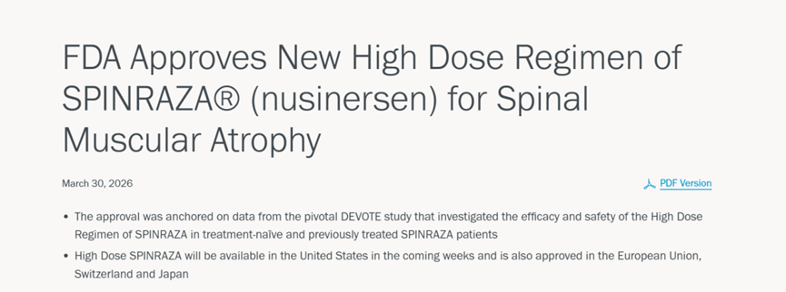 2026 年 3 月 30 日,Biogen宣布FDA已批准诺西那生钠(SPINRAZA®)高剂量治疗方案(含 50 毫克 / 5 毫升与 28 毫克 / 5 毫升两种规格),用于治疗脊髓性肌萎缩症(SMA)。