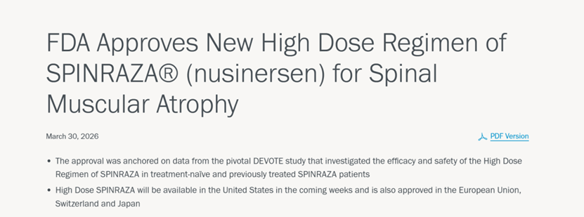 3 月 30 日,渤健公司(Biogen)宣布,美国 FDA 正式批准诺西那生钠(SPINRAZA®)高剂量治疗方案,包含 50 毫克 / 5 毫升与 28 毫克 / 5 毫升两种规格,用于治疗脊髓性肌萎缩症(SMA)。