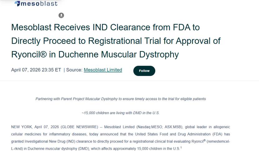 4 月 7 日,Mesoblast 公司宣布,美国 FDA 已批准其药物 Ryoncil(remestemcel-L-rknd)直接开展治疗杜氏肌营养不良症(DMD)的注册性临床试验。DMD 作为一种严重罕见遗传病,目前尚无治愈方法,此次获批为患儿及家属带来了新的期待。
