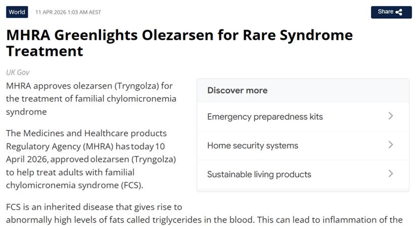 4 月 10 日,英国药品和健康产品管理局(MHRA)正式批准 Ionis 制药旗下反义寡核苷酸疗法 Tryngolza(olezarsen),用于治疗成人家族性乳糜微粒血症综合征(FCS)。该药物此前已相继获得美国食品药品监督管理局(FDA)及欧盟批准,此次 MHRA 获批进一步扩大其在欧洲市场的可及性,为英国 FCS 患者带来全新的针对性治疗选择。