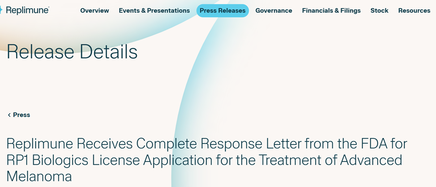 当地时间 4 月 10 日,Replimune 公司正式宣布,已收到美国食品药品监督管理局(FDA)针对 RP1 联合纳武利尤单抗治疗晚期黑色素瘤的生物制剂许可申请(BLA)的完整回复函(CRL)。