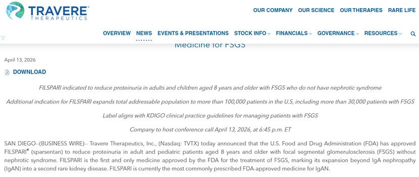 4月13日,Travere Therapeutics公司宣布,美国FDA正式全面批准其药物FILSPARI(sparsentan),用于治疗无肾病综合征的8岁及以上局灶节段性肾小球硬化(FSGS)成人和儿童患者。