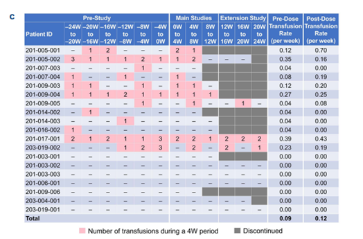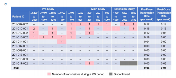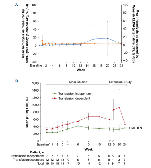 相比之下,需要输血的患者基线LDH平均值明显高于不需要输血的患者,并且在zilucoplan治疗期间仍呈现上升趋势,在第20周达到峰值(924.7 U/L)(图3B)。同时,在转换组中需要输血的12名患者中,有4名(包括一些治疗时间不到6个月的患者)在接受zilucoplan治疗后也停止了输血(图3C)。