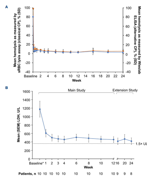 图3A、B:zilucoplan对依库珠单抗转换队列中PNH患者的疗效