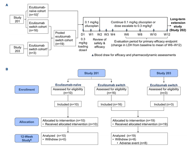 阵发性睡眠性血红蛋白尿症(PNH)是一种罕见的慢性克隆性造血干细胞疾病,其发病机理中,补体系统的异常激活扮演着至关重要的角色。zilucoplan是一种新型的C5抑制剂,这种小分子(3.5kDa)的15氨基酸大环肽以高亲和力和特异性结合C5,展现出了独特的药理特性。因此,研究人员开展两项为期12周的II期研究(研究201,NCT03078582;研究203,NCT03030183)和一项长期扩展研究(NCT03225287)中,以评估zilucoplan在PNH成年患者中的疗效、药代动力学、安全性和耐受性。