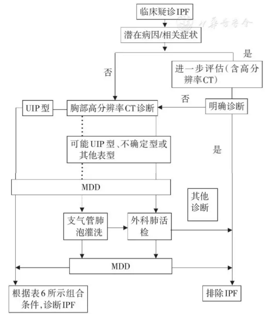 在2000年国际专家共识中,专家组定义特发性肺纤维化(idiopathic pulmonary fibrosis, IPF)为一类原因不明、慢性进行性加重的纤维化性间质性肺炎;老年人多见,病变主要局限在肺部。IPF的组织病理学表型为寻常型间质性肺炎(usual interstitial pneumonia, UIP);临床主要表现为进行性加重的呼吸困难、肺功能减退,预后很差。2011年,美国胸科学会(American thoracic society,ATS)、欧洲呼吸学会(European respiratory society,ERS)、日本呼吸学会(Japanese respiratory society,JRS)、拉丁美州胸科学会(Association of Latin American Thorax,ALAT)在2000年共识的基础上联合发表了IPF临床诊疗指南,提出了基于胸部影像学和组织病理学表现的IPF诊断标准。但在随后的临床应用中,发现2011年的IPF诊断标准还存在一些缺憾(表1),故制定了2018年版IPF诊断的临床实用指南,将IPF的胸部影像学和肺组织病理学表型重新定义,分为"UIP型"、"可能UIP型"、"不确定型"和"其他诊断"4个类型,并对IPF诊断措施的相关问题给出专家推荐意见,以协助临床医生更准确地诊断IPF,并结合患者的具体情况制定合适的诊断流程。 一、研究方法 符合ATS、ERS、JRS、ALAT的相关政策和指南制定流程,由指南制定小组成员、专家团队、患者陪护人员根据临床实践中的具体需求,凝练并提出需要关注的相关问题,并通过系统性复习文献的方法,针对临床问题提出专家推荐意见。仍采用推荐分级的评估、制定与评价方法(grade of recommendations assessment, development and evaluation,GRADE)来评价证据的等级质量和推荐意见的级别(表2)。每条推荐意见均需要70%以上的得票率,若低于70%则定义为无推荐意见。"推荐"指推荐意愿等级较高,"建议"则指推荐意愿等级较低或指特定情况下推荐。 二、临床表现 IPF患者主要表现为不明原因的、缓慢进展的劳力性呼吸困难、咳嗽及双肺底的爆裂音,可伴有杵状指,无其他系统性疾病的临床表现。IPF的发病率随着年龄的增长而增加,典型表现为60~70岁起病,隐匿性呼吸困难,少数患者可以IPF急性加重的形式起病,表现为数周内不明原因的、急剧加重的呼吸困难,且胸部高分辨率CT显示在肺纤维化基础上新发磨玻璃影。50岁以前起病的IPF患者罕见,此时需要警惕是否存在潜在的结缔组织病(connective tissue disorder, CTD)或家族性肺纤维化。IPF患者中男性比女性多见,且多有吸烟史;胃食管反流、慢性病毒感染(包括EB病毒、丙型肝炎病毒等)、家族性间质性肺疾病(interstitial lung disease, ILD)等都是IPF的危险因素。还可以有多种合并症,包括肺气肿、肺癌、肺动脉高压、睡眠呼吸暂停及冠心病等。大约有30%的散发或家族性肺纤维化患者存在肺纤维化相关的遗传易感基因。 三、诊断措施 主要从胸部高分辨率CT、肺活检组织病理学检查两方面阐述,统一将IPF的形态学表型(包括影像学表型和组织病理学表型)分为"UIP型"、"可能UIP型"、"不确定型"和"其他诊断"4个类型。强调了诊断IPF过程中胸部高分辨率CT的技术参数、操作过程以及重新定义了ILD相关的胸部高分辨率CT表型,并详细阐述了肺组织病理UIP型的镜下特征。 (一)胸部CT 1.高分辨率CT技术: 诊断IPF非常依赖高质量的胸部高分辨率CT,高分辨率CT的技术参数要求:(1)CT扫描速度越快(调整准直、旋转时间及螺距等参数),图像越不受呼吸运动影响,但电压和电流水平需要根据现行推荐的CT扫描参数确定。(2)图像采集过程:首先在吸气末、仰卧位采集1次图像(容积扫描);然后在深呼气后的呼气末、仰卧位再次采集图像(容积扫描或序列扫描);最后一次扫描则主要是为了排除第1次扫描中体位因素的影响,可以是全肺扫描或局限于下肺的扫描。务必在CT扫描前对患者做详细地CT扫描过程的宣教,以确保是在吸气末完成容积扫描,减少因吸气不足引起的伪影;扫描过程中可以使用自动播放的指令性语言来指导患者完成整个扫描过程。(3)对于近期呼吸困难加重的ILD患者,必要时安排CT肺血管重建来明确是否有肺栓塞;注意是否有新发的磨玻璃影以明确是否发生急性加重。高分辨率CT技术参数见表3。 2.UIP型高分辨率CT表现的特征: UIP型高分辨率CT的特征包括蜂窝、牵张性支气管或细支气管扩张(主要出现在磨玻璃影、细网格影中)。(1)蜂窝:是指集簇的薄壁囊腔,一般大小一致(直径为3~10 mm,甚至更大),常伴有网格影、牵张性支气管或细支气管扩张;蜂窝常出现在多个CT层面,也可以出现在单个CT层面。蜂窝主要需要与间隔旁肺气肿、牵张性细支气管扩张、胸膜下肺大疱鉴别。(2)牵张性支气管或细支气管扩张:这也是肺纤维化的重要影像学表现,可以表现为支气管/细支气管腔直径不递减,或支气管/细支气管腔明显扩张变形;在UIP型ILD中,主要表现为外周、胸膜下分布,且常伴有蜂窝影。(3)磨玻璃影:是指肺透过度下降,但支气管血管束仍隐约可见;鉴别单纯的磨玻璃影,还是在细网格影基础上的磨玻璃影甚为重要,单纯的磨玻璃影不是UIP型ILD的典型表现,若IPF患者出现这类影像学需要警惕是否发生了急性加重;但IPF患者则可以在细网格影基础上出现磨玻璃影,这类患者常常合并牵张性支气管或细支气管扩张。 3.高分辨率CT表型: 建议使用4种高分辨率CT表型(表4)来描述CT表现,包括UIP型、可能UIP型、不确定型、其他诊断:(1)UIP型:UIP型CT表型是IPF患者的胸部高分辨率CT特征,必须有蜂窝影;可伴有外周分布的牵张性支气管或细支气管扩张。典型的UIP型表现为下