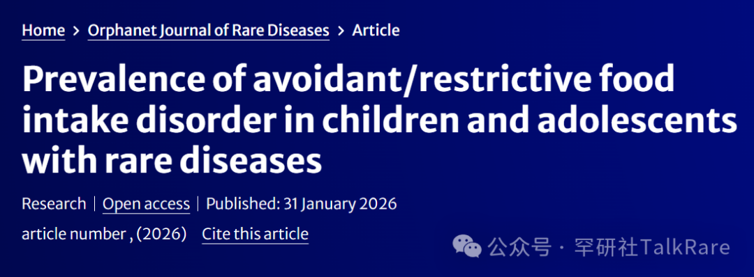 本项观察性研究数据源自一项多中心临床研究,选取 309 个罕见病患儿家庭,通过自评量表(169 例)与他评量表(家长填报,502 例),评估德国 8~21 岁罕见病儿童及青少年的 ARFID 症状患病率。研究对比了罕见病受试群体与普通人群数据、伴 / 不伴 ARFID 症状受试群体的差异,同时分析不同罕见病亚组间的区别;此外还探究了进食障碍精神病理表现、社会人口学变量与社会心理变量之间的相关性。