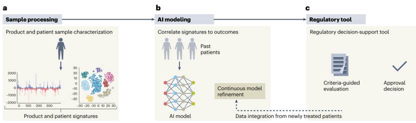 a. 采用多参数检测方法,对罕见病及极罕见病患者的自体细胞或基因治疗产品与患者样本进行特性表征,生成高维特征图谱。b. 基于整合数据集训练的 AI 模型,识别产品特征、患者特征与临床疗效之间的关联。c. 模型得出的结论用于构建监管决策支持工具,为批次放行、临床终点及证据充分性相关讨论提供依据。随着接受治疗的患者增多及更多数据纳入,该工具将持续优化(虚线箭头所示)。